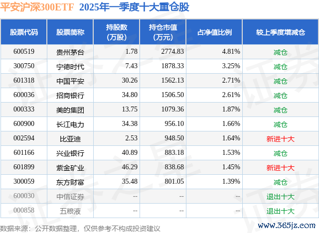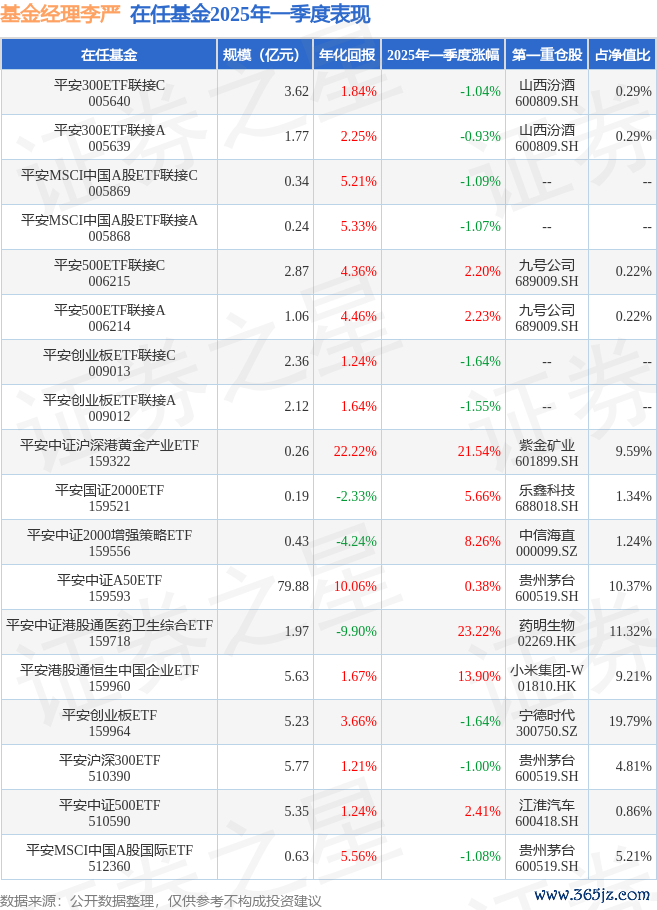 从基金规模来看,平安沪深300ETF基金2025年一季度公布的基金规模为5.77亿元,较上一期规模6.02亿元变化了-2504.61万元,环比变化了-4.16%。该基金最新一期资产配置为:股票占净值比98.87%股天下,债券占净值比0.01%,现金占净值比1.2%。从基金持仓来看,该基金当季前十大股票仓位达22.92%,第一大重仓股为贵州茅台(600519),持仓占比为4.81%。