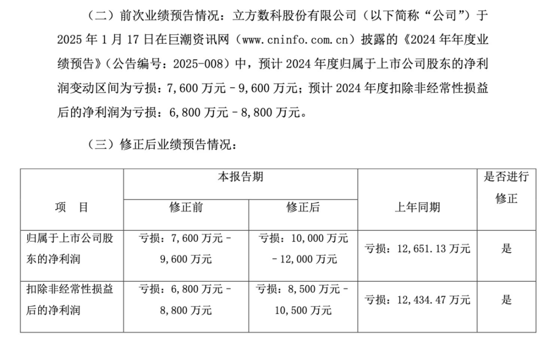 业绩预告修正后,立方数科预计2024年净利润亏损1亿元—1.2亿元,预计扣除非经常性损益后的净利润亏损8500万元—1.05亿元,亏损额较之前预计的有所扩大。