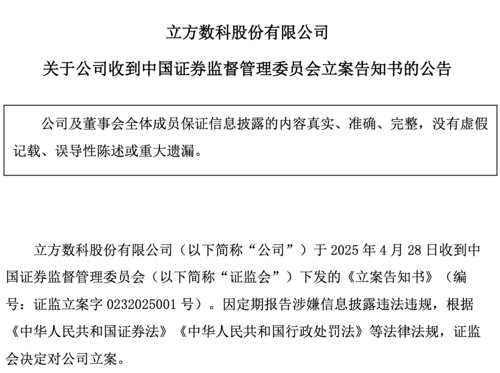 【导读】立方数科因定期报告涉嫌信息披露违法违规而被立案