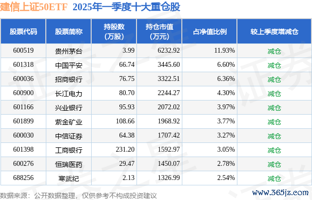 从基金规模来看易投投,建信上证50ETF基金2025年一季度公布的基金规模为5.22亿元,较上一期规模6.07亿元变化了-8466.91万元,环比变化了-13.95%。该基金最新一期资产配置为:股票占净值比99.45%,无债券类资产,现金占净值比0.63%。从基金持仓来看,该基金当季前十大股票仓位达48.57%,第一大重仓股为贵州茅台(600519),持仓占比为11.93%。
