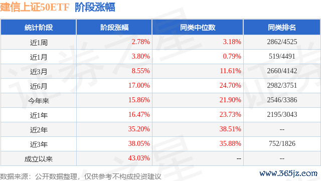 从业绩表现来看,建信上证50ETF基金过去一年净值涨幅为13.21%,在同类基金中排名921/2216,同类基金过去一年净值涨幅中位数为11.09%。而基金过去一年的最大回撤为-11.17%,成立以来的最大回撤为-39.53%。
